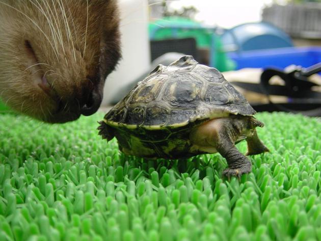 In the photo, Angel is patting the baby, but now that the turtle is older, she’s big enough to protect herself from playful cats.