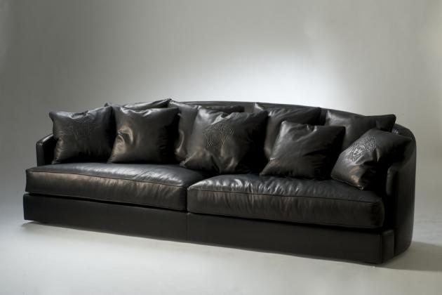 The “Design” line is modern in shades of black, white, gold and silver. The Asteroid sofa has five pillows made from genuine leather, and the Eclipse coffee table boasts a tinted glass top and sinuous chromium legs.