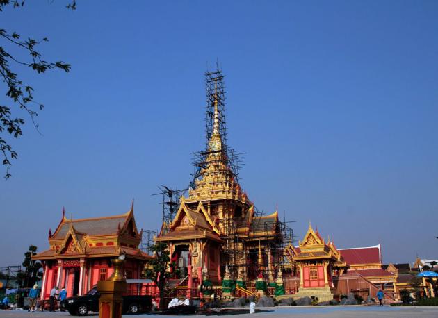 The amount of work, the high level of wood technology, the single-mindedness and the total mobilisation of labour and material resources are beyond imagination. During the reign of King Rama II, for the royal pyre of 80 metres and the accompanying eight 40-metre-high meru-thits, ra-tha and other complementary structures, the amount of timber and bamboo transported to the funeral site in the capital was as follows: