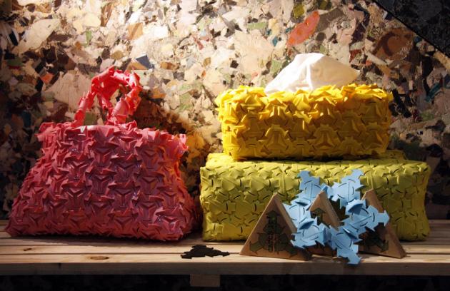But don’t miss the rubber “jigsaw pieces” that can be fit together to form a tissue box, necktie, handbag, lamp or coaster.