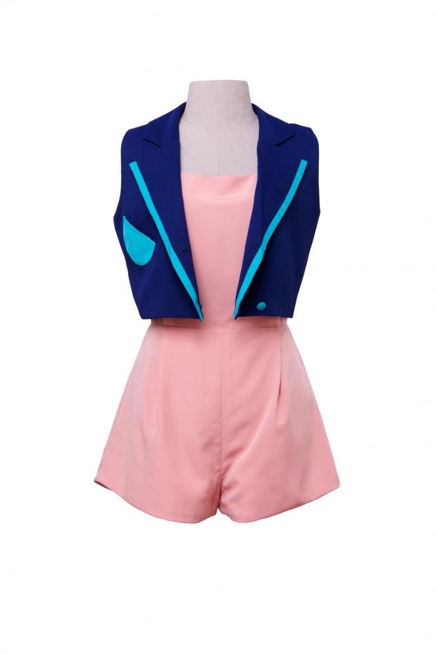 “Ariel” has a lively, bright look with a cute salmon-shaded cotton jumpsuit with a midnight blue vest, and a short blue dress with ruffle collar.