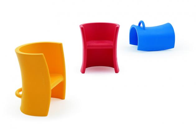 Three award-winning chairs communicate casualness and positive thinking. The “Spun” spinning chair, designed by Thomas Heatherwick for Magis, is suitable for both indoors and outdoors, the seat, backrest and frame all in one unique spinning-top design.