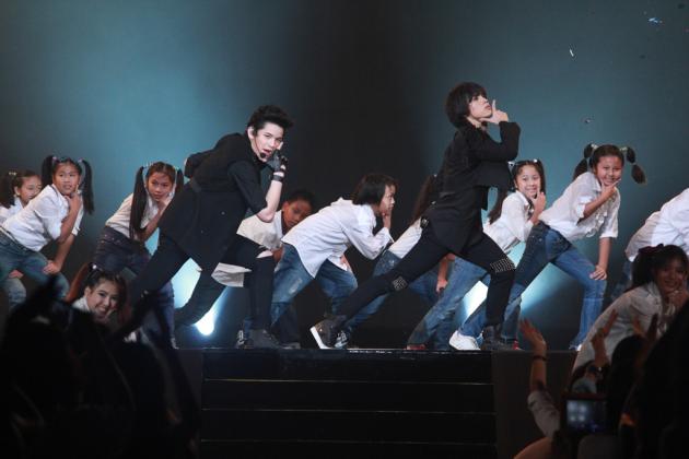 Fans, who have continued to follow the two former AF8 contestants since the reality show, screamed as Tao and Kacha emerged on stage singing Justin Bieber’s “Baby” before slipping from suits to cute animal themed hoodies for Dong Bang Shin Ki’s “Balloons”.