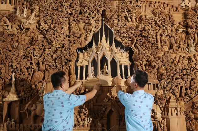 Likewise, 79 of the centre’s woodcarvers have taken almost three years to finish the “Sangthong” and the mythical “Himmavanta forest” wooden screen, a double-sided work featuring the Sangthong story on its front and carved animals, among them elephants, illustrating the story of the Himmavanta forest on the back. The four main characters – Sangthong, Rojana, Kinnorn and Kinnaree – have been sculpted out of teak in life size dimensions and decorated with jewel beetles and will stand in front of the screen, itself 36 centimetres wide, six metres long 5.20 metres high.