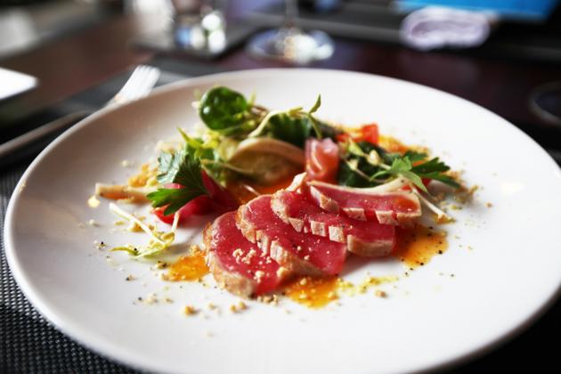 During our visit, the soup of the day was Blue Crab & Coriander, a cold tomato-based soup a little thicker than gazpacho, and liberally scattered with chunks of blue crab meat, fresh cucumber and diced fresh tomato in a tart and fruity, herbal broth. The crunchy ‘onion tempura’ on top of the soup added to the tasty and meaty combination. The soup was followed by a salad of Yellow Fin Tuna & Thai Sweet Basil, with the perfectly pan-seared fresh tuna served with a tangy, lightly-dressed green salad of rockets, parsley, bean sprouts, sweet pickled ginger, strings of fish noodles and small dollops of Thai red curry sauce. The salad was fresh and tasty and the red curry sauce added a spicy, aromatic punch.