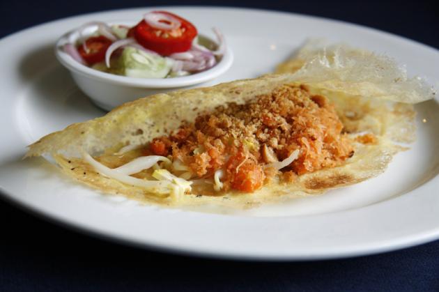 The all-time favourite mee krob - sweet-and-sour crisp-fried rice noodles with shrimps- is delectable. The red sauce is obtained from the dried red chillies that are boiled until soft and then spun and simmered with sugar, vinaigrette and salt to get sweet-and-sour taste. The sauce is then stir-fried with the puff-fried rice noodles and garnished with pickled garlic, bean sprouts, shredded Thai-style omelette and Chinese chives. Som saa (bigarade, aka Seville orange), an increasingly rare and expensive citrus fruit, is added to give a piquant bitterness and pleasant odour.