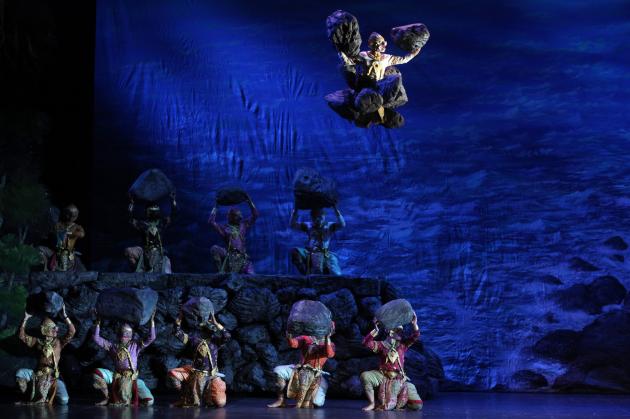Fifteen months after “The Battle of Maiyarap”, the Support Foundation’s khon masked dance theatre has returned to the stage of the Thailand Cultural Centre. For this year, Her Majesty the Queen suggested the “Chong Thanon” (literally, “building the roadway”) episode of the Ramakien.