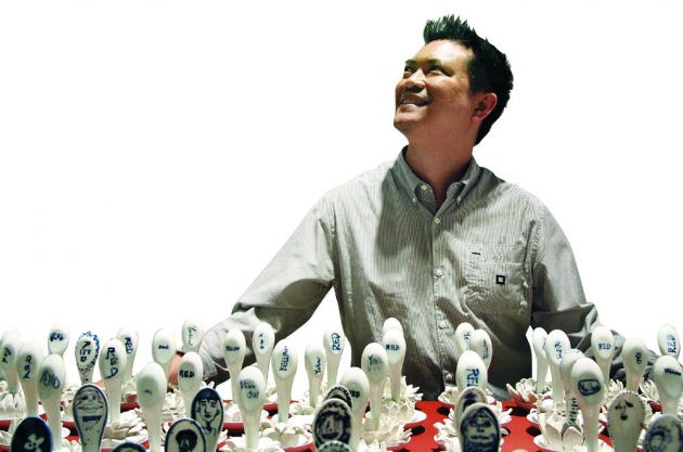 In China for a residency programme at the Pottery Workshop, Vipoo demonstrated his sadness at the conflict between red and yellow shirts by inviting 50 Chinese volunteers to help him paint portraits on 125 porcelain spoons then write the word “red” or “yellow” on each spoon.