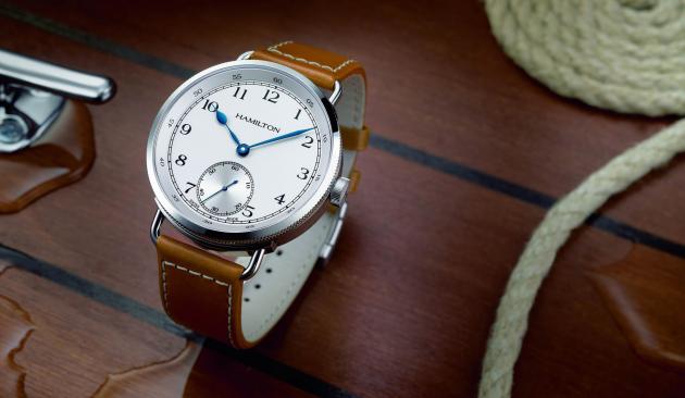 Reminiscent of the distinctive blue hands of a Hamilton marine chronometer introduced in the 1940s are hand-made, shaped hands in ocean-blue. A traditional case shape integrates loops for the leather strap and a bezel with delicately patterned sides. The dial gets a classical look through a velvety finish on its silver colouring.