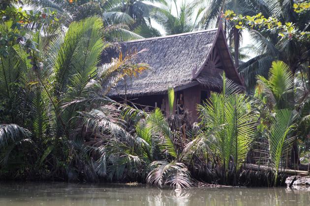 As the boat carrying our media group from Wat Nang Takian rounds the bend in the river and we approach Amphawa district in Samut Songkhram, we can see a hand waving from one of the traditional houses perched on stilts in the coconut orchards lining the banks. As we get near, we see that the hand belongs to a beautiful long-haired woman attired in traditional Thai dress. She’s apparently signalling that we’ve arrived at the set of “Pee Mak Phra Khanong”.