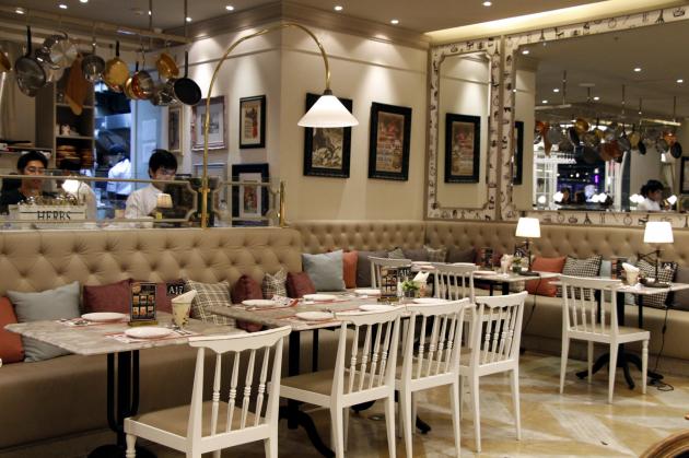 Set out in black and white like a French “vintage contemporary” house, it has a serene living room and a refreshing garden, with seating for 85 split between them. Glass walls surround comfy earth-tone sofas and wooden chairs and tables, sharing the view as well.