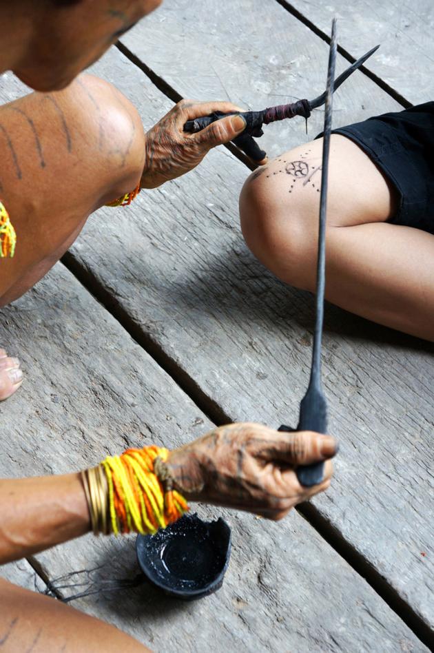 Using the sharp splintered rib of a palm leaf and natural ink made of sugarcane syrup and coconut-shell charcoal, a Mentawai tattoo artist, or sipatiti, meticulously draws a simple design on his client’s skin.