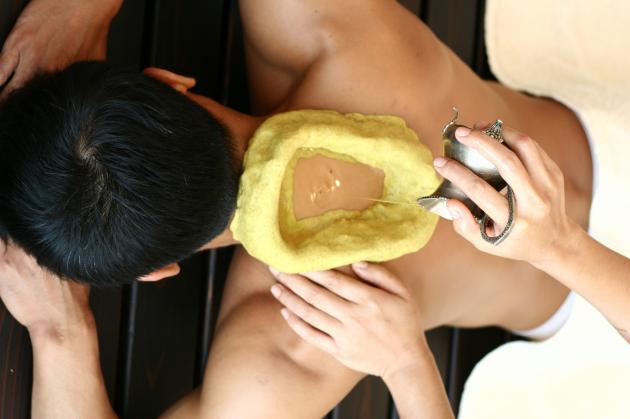 In another treatment, rarely seen in Thailand, a ring of bread dough was placed on my hurtful upper back as I lay face down. It formed a barricade, a pool into which warm oil was poured a drop at a time. It felt great. Suchada said this would enhance the energy flow by opening the marma at that juncture.