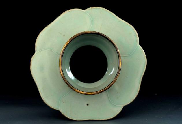The cup holder is a hollow, bowl-shaped cylinder with a flat, five-petal flange and a flared foot. The celadon glaze was well distributed with a few big cracks. The upper rim was inlaid with copper.
