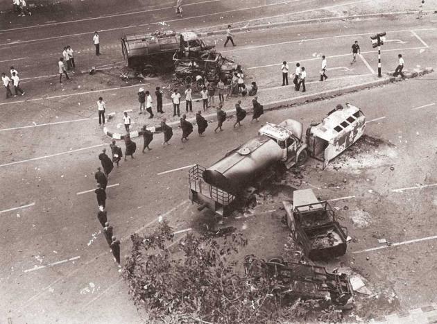 Sathan’s previously unpublished shots paints another side of the picture, showing a row of monks walking along Rajdamnoen Avenue past burned out vehicles the day after the uprising.