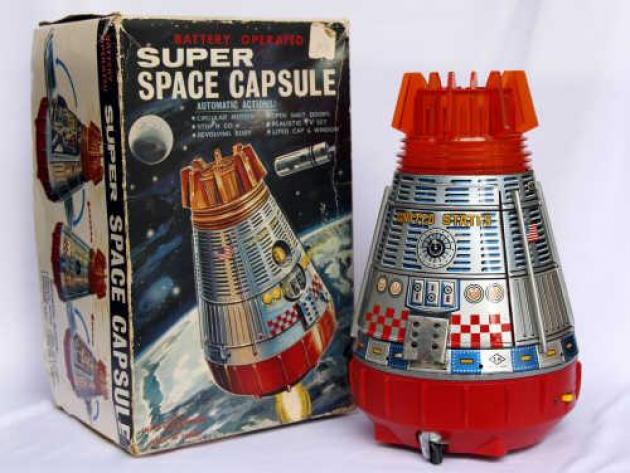 There’s a 1986 Super Apollo Space Capsule with nosecone that lights up. It not only rolls around with a battery’s help, it will pop open a door to reveal a miniature but realistic TV set inside. Nasa also provided the inspiration for a 1962 Super Astronaut robot that packs laser guns and makes noises when it’s shooting.