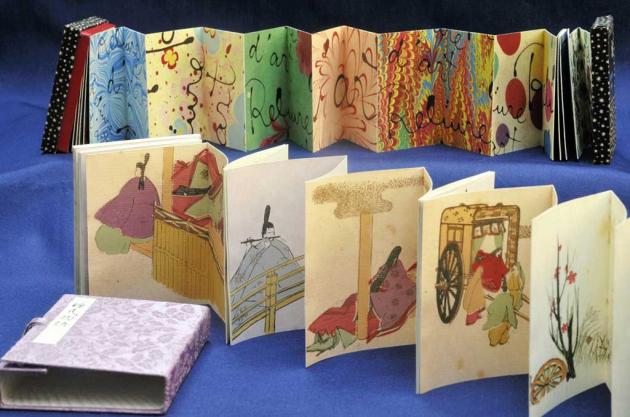 Some are artistic enough for display. An accordion book of marble-patterned pages, for example, is an artist’s original. In another, containing “The Tale of Genji”, pale yellow-green and purple pop out from the pages and reflect the elegance of the story.