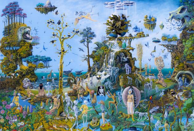 In “A Land Where Life is Found” from 2009, the Garden of Eden is an ovular paradise of lush forest, misty waterfalls and a multitude of fauna. The harmony in which they exist contrasts sharply with our endangered world of poisoned air and water.