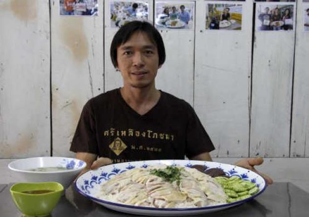 Sri Lueng Potchana on Soi Phaholyothin Rama Theatre in Saphan Kwai has been around for 33 years and is famous for its delectable boiled chicken rice and noodles with steamed pork in herbal soup. But until last May, it never had anything on the menu to compare with “Khao Man Kai Giant”.