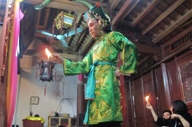 Hung is conducting a len dong ceremony, involving a type of trance. It forms the main practice of the religion Dao Mau (Mother Goddess).