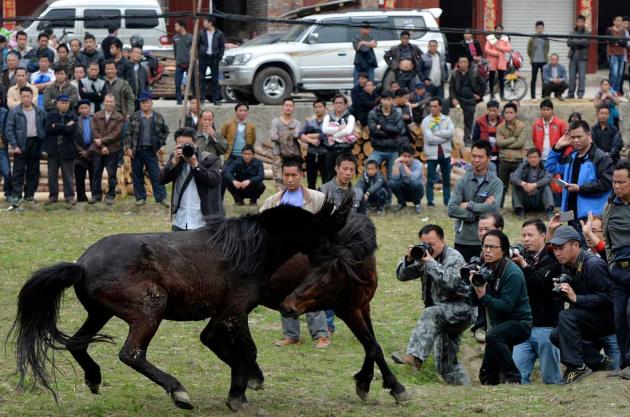 Hooves clash in mid-air, a stallion bites his opponent and delighted spectators cheer wildly. In southern China some welcomed the Year of the Horse by watching the animals fight.
