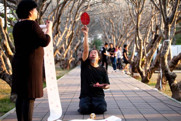 Respected Nan artist and owner of the Nan Riverside Art Gallery Winai Prabripu declared the festival open then handed over the town to the artists who would be contributing their creations to the three-day event. Among the headliners were national artist and respected poet Nawarat Pongpaiboon, songs-for-life legend Surachai Chanthimathorn aka Nga Caravan and that famous bete noir of the Bangkok art world, Vasan Sitthiket himself. Asiatopia, the international performance art festival founded by Chumpon Apisuk, sent along some members too and they happily mingled with the crowd.