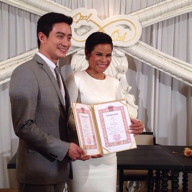 It wasn’t a grand affair, but it was definitely conducted with style, and now the two are busy again preparing for the wedding reception at the Plaza Athenee Hotel on April 6. “The preparations are half done,” Oak said at a press conference at PPTV. Opal wasn’t there because she was busy moving stuff into her new home – his place, he explained.