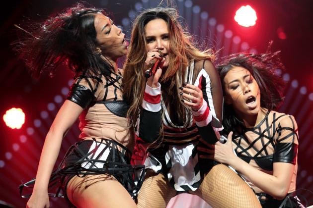 Fans were both delighted and shocked when Tata returned to the stage for “Shot”, moving seductively alongside her two female dancers, one of whom briefly groped her breasts, then locked lips with each other at the end of the song.