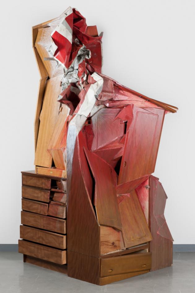 He attached a chest of drawers to a crumpled red Coca-Cola signboard. The result is the tower-shaped installation.