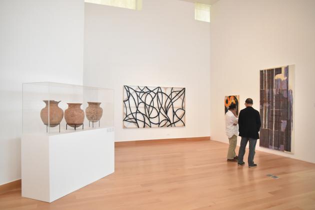 The earthenware discoveries of Ban Chiang, more than 2,000 years old, co-exist harmoniously with abstract paintings by Udomsak Krisanamis thanks to their shared feature, the lively creative patterns.