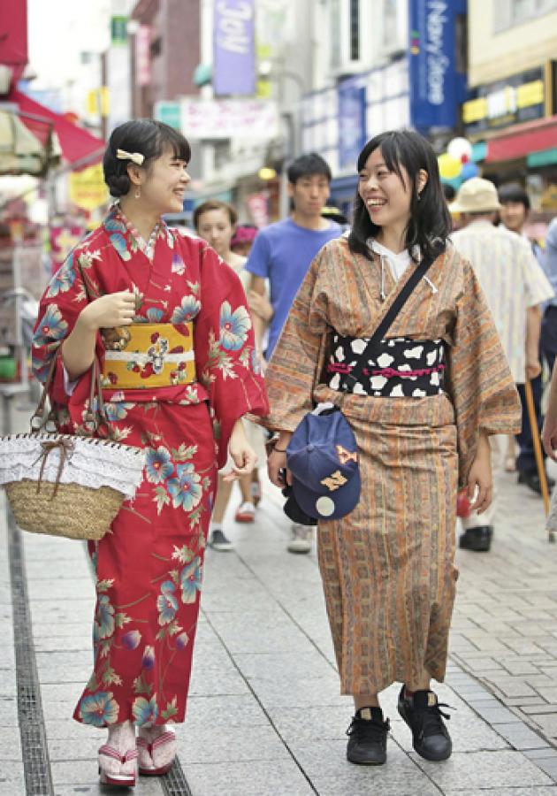 In July, about 30 men and women wearing kimono and yukata gathered at a water-bus stand in Asakusa, Tokyo, for “Kimono Jack.” The event started by kimono lovers in Kyoto in 2010 invites people wearing kimono to gather in downtown and tourist spots.