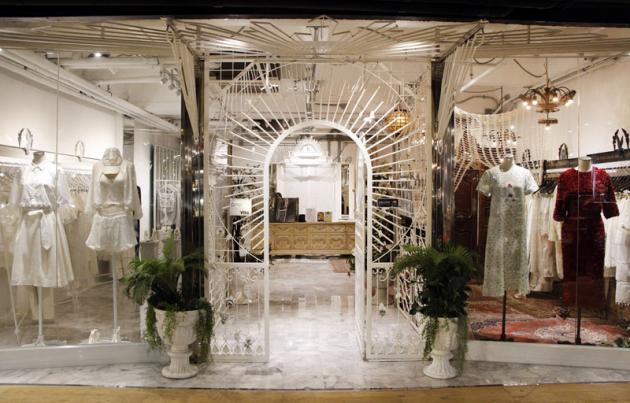 Their Siam Center shop draws on that art studio and is entered through a white arch. The interior is stark white too yet sets off the lace outfits in white and ecru that hang from the rails.