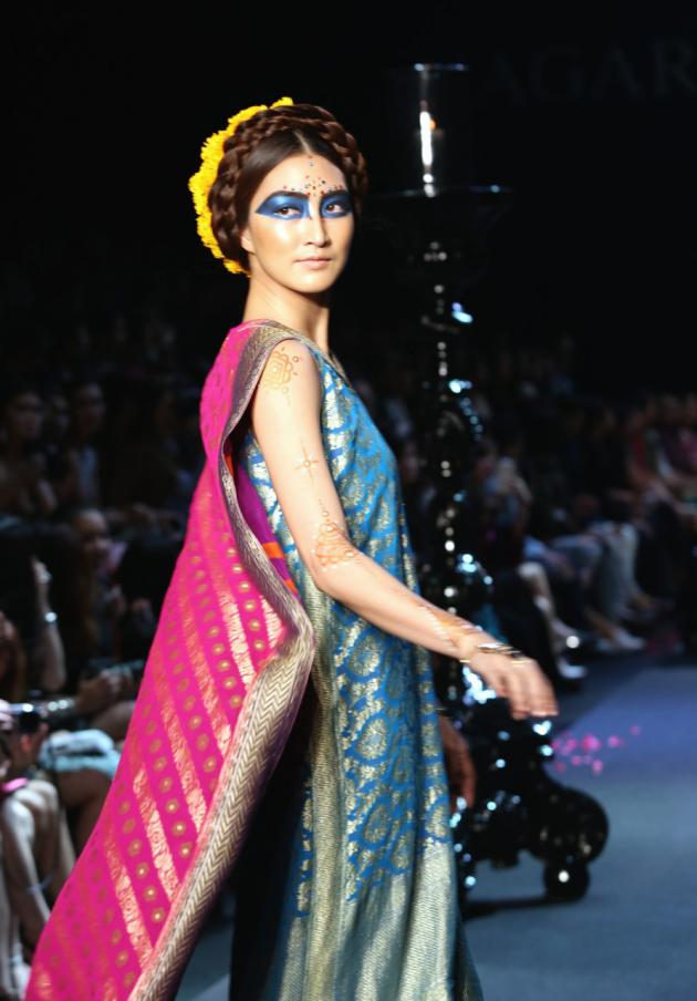 Nagara Sambandaraksa, who showed his new collection on the first day of the four-day fashion week, took spectators on a passage to India through a series of exuberant colourful dresses. The designer used exotic materials sourced from various regions across India including hand-woven fabrics, native floral prints and made-to-order cloth woven and dyed by India artisans.