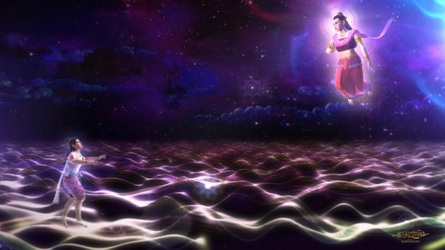 In the second act, the prince is already grown up and is travelling by boat to Suvarnabhumi when a massive storm blows up and wrecks his ship. He survives by swimming for seven days and seven nights and finally gets help from the angel Manee Mekhala, who takes him to Mithila.