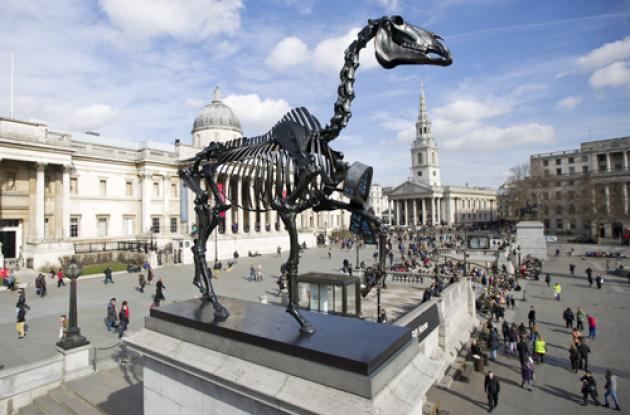 A sculpture of a strutting horse skeleton was unveiled in London’s Trafalgar Square last week – wearing a London Stock Exchange prices ticker in an allusion to the city’s financial power.