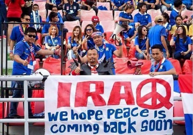 A photo of the banner was posted on the “Iraqi Football News” Facebook page with the caption “Respect and thanks to Thai football fans for their great message at Thailand vs Iraq match yesterday. Thanks, Thailand.” It drew more than 6,800 “likes” and, better still, a lot of Thais also visited the page to offer more kind words.