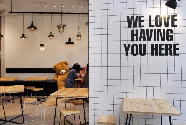While its mothership is creatively fashioned from steel shipping containers, the downtown cafe is decked out in highly fashionable industrial loft style, with a predominantly black-and-white decor, mosaic wall tiles and exposed metal ducts. Vintage hanging lamps add the final touch and are kept lit even though there’s plenty of glass to let the natural light stream in.