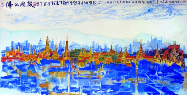 Chinese artist Kuku Chai Bukuk was deeply moved by her visits in August to the Grand Palace in Bangkok and the temples of old Ayutthaya. Now she’s back to display the painting that resulted, a rendering of venerable pagodas titled “The Kingdom of the Buddha”.