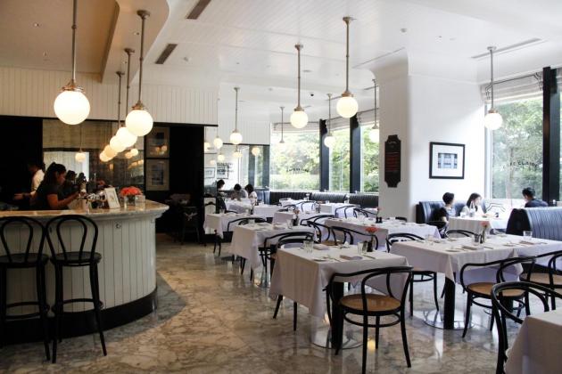 Light streams in through tall glass windows, and the outdoor view is of taller green trees. Guests settle into leatherette banquettes and wicker-based armchairs, if not perched on wooden stools at the bar. The floor is grey marble, the white walls hold artful monotone prints and old-fashioned bistro signs, and the ambience is easygoing.