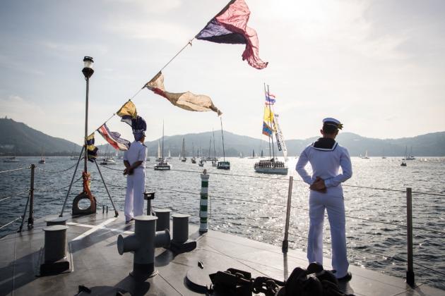 The Navy ship along with other Royal Thai Navy vessels were fully dressed and stationed off Koh Pu, and joined with racers and cruisers from the 2015 Regatta fleet. At 8.30am, a sound signal was given for the fleet to form to formally complete the Royal Salute in beautiful conditions ahead of the first day of the regatta.