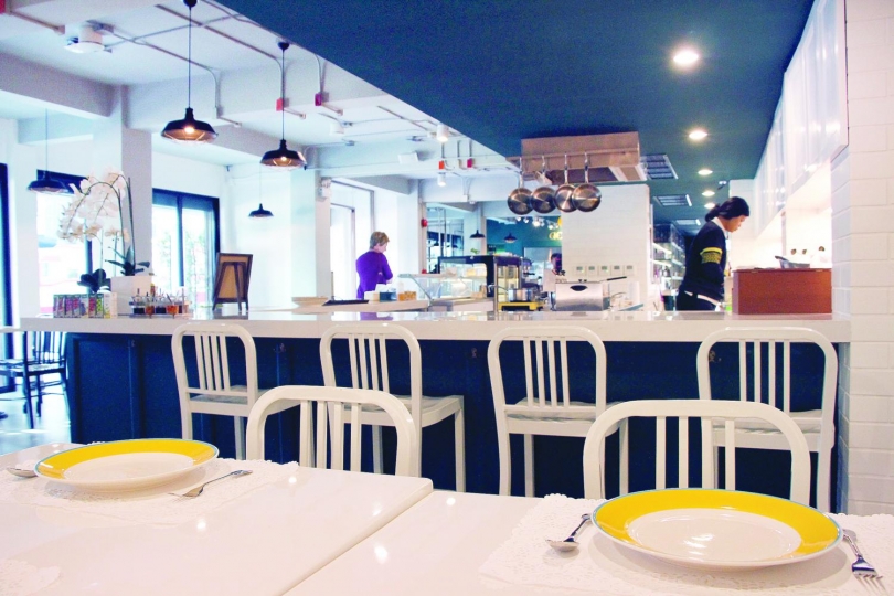 Located on the first floor of the new company building next to BTS Rajthevee station, the 80-square-metre restaurant has plenty of windows to let the natural light stream in. There’s nothing exaggerated about the interior design; everything is neat and clean with light grey floor tiles, white walls and a dark green counter with a marble top. The shopping area is close to the entrance, its shelves filled with a wide variety of Doi Kham products such as brown rice, ready-to-drink juices and fruit juice concentrates from the royal projects initiated by His Majesty the King Bhumibol Adulyadej. The dining area on the right boasts an open kitchen where diners can watch the chefs at work.