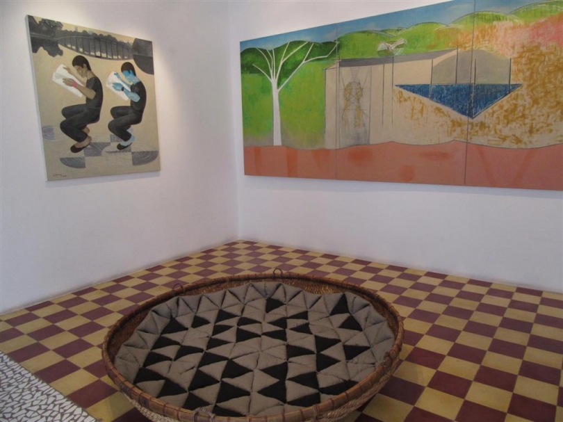 Dominating the middle of the gallery is an enormous bamboo “nest” with triangular cushions arranged in a pattern. It’s a mandala of the universe, or perhaps a rendering of the sacred dance of Venus and Mars, the conjunction of the shapes suggesting the nature of the relationship.