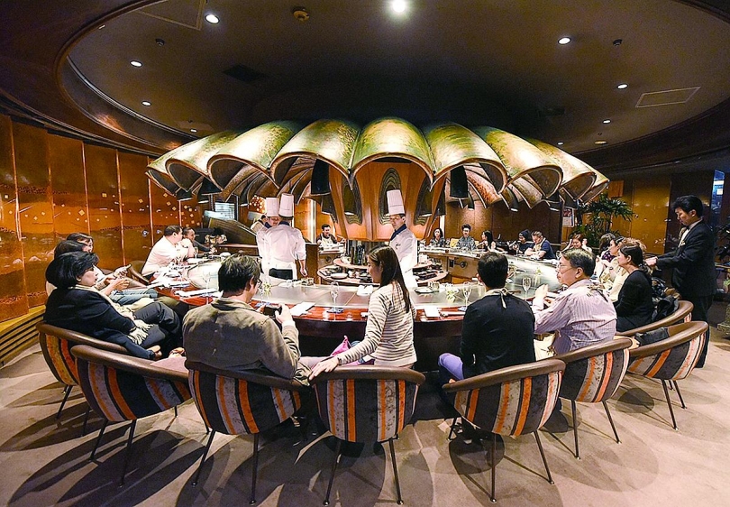The teppanyaki-style open show kitchen allows diners to enjoy both watching the skilled manoeuvres of the chefs as they prepare the food on flat hot grills and the finished cuisine itself. Only medium and medium rare are available in terms of cooking choices for the steak, which comes in cuts of Kobe beef prime sirloin, top sirloin, tenderloin and chateaubriand. If beef is not your thing, there’s plenty of seafood on offer including lobster, sole, scallop, abalone and prawn. The dinner courses range from 12,900 yen (Bt4,200) to 32,400 yen.
