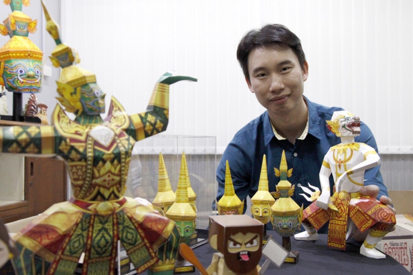 A graduate in computer engineering at Srinakharinwirot University, Prem left the game company behind to return to Samut Songkhram, his home province, and help with the family business. Initially as a hobby, he set up the Boxburi store and put his creature-creator talents to good use fashioning a Hanuman out of glossy, waterproof art paper. The Monkey King in classic costume is rendered with a laser printer.