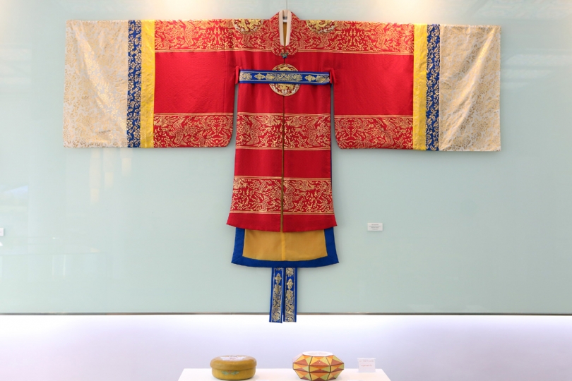 The highlights of the exhibition are the treasures from Korea, 23 of which feature on the Seoul Intangible Cultural Heritage lists. In addition to Sim Yong-sik’s somok (doors and window), visitors can admire Park Kwang-hoon’s delicate needlework (chimseon) in the hanbok hanging on the wall. Chimseon refers to the needlework produced by the seamstress – a chimseonjang. The specific technique and delicate patterns she used reflect the class and usage in the hanbok for the queen.