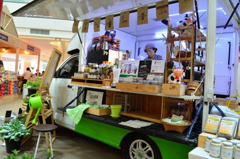 Produce includes organic fruits and vegetables from the centre for the development of organic agriculture standard; vegetables from royal projects and processed fruits by Doi Kham; processed products and fruits from Kamnan Chul Farm; Mah Boon Krong rice; farm equipment from Hydro Hobby; grilled sweet potato and pumpkin by Berrybana; healthy fruit smoothies from Fresh’ C by actor Thakrit “Phet” Tawanpong; lemonade by Lemon Me; legume and mushroom juice by Up Thailand; Homsuwan pineapples; Nucha Farm’s watermelon; Nine Tamarind’s tamarind products; Aunt Chaba’s durian; deep-fried and grilled mushroom (mushroom snacks); Magna Gac juice; and Yumkuza’s Caulerpa racemosa (sea-grape seaweed).