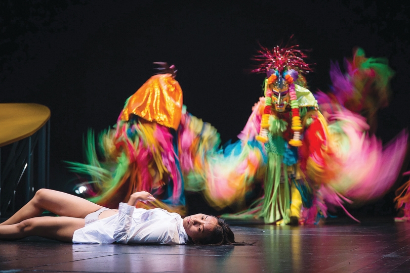 Flynow’s designer Piyaporn Bhongse-tong’s costumes showed the sharp contrast between the Phi ta khon-inspired costumes and the off-white attire of the dancers when they represented the spirits. Working in a totally new space, Japanese lighting designer Asako Miura’s job wasn’t simple and while all the dramatic requirements were met successfully, I would have liked to see the dancers float more up and down the slopes. Her compatriot, sound designer Hiroshi Iguchi, keenly combined the soundscape he recorded in Dan Sai and Northeastern Thai tunes led by the khaen, a reed mouth organ, with electronic sound.