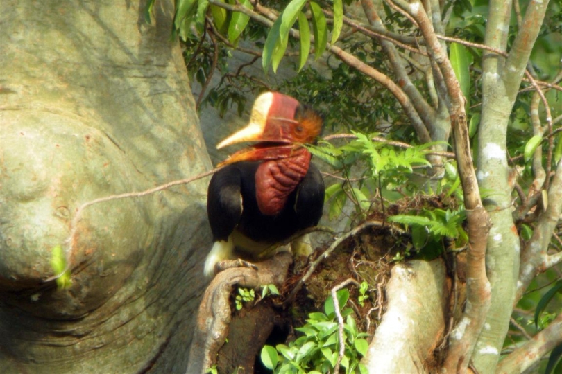 Dr Nigel J Collar of BirdLife International is an expert on these larger hornbills, noting that they have specific nesting requirements, choosing the largest living trees with nest holes topped with a perch for the male to use while provisioning the female.