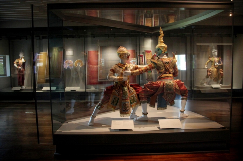 On entering the galleries, visitors first learn about the early history of khon through one of the oldest panels still in existence. Painted in black and gold lacquer and used in performances from 1851 to 1868, it depicts a royal rite called “The Churning of the Ocean” ceremony and is usually on display at the museum of the Emerald Buddha Temple. There is also a reference costume on a doll-like model that is thought to show what a khon costume might have looked liked early in the reign of King Rama V.