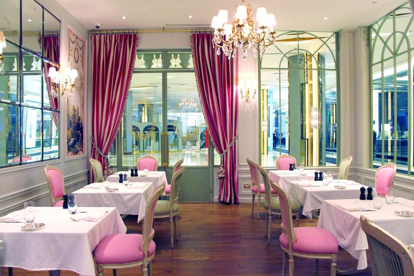 The terrace has a very Parisian feel. Running the length of a glass-fronted facade, it is accessed by an entryway topped with a wrought iron awning that is similar to its Champs Elysees shop in Paris. The terrace is rich in green and ochre tones while
